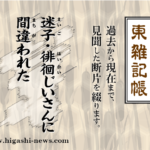 2022年2月22日 / 最終更新日時 : 2022年2月22日 higashiadmin 東 雑記帳 東 雑記帳 - 迷子・徘徊じいさんに間違われた もう九年近くも前のこと。朝の十時頃、自宅の居間にいたら、行方不明者に関する市役所の放送が聞こえてきた。防災無線行政放送というやつだ。それらしき人を見つけたら連絡してほしいというのである。 家の者が窓を開け、「また、迷子の […]